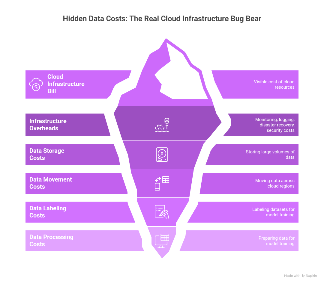 Infrastructure overheads are another significant cost driver. The cost of monitoring systems and logging platforms, disaster recovery, security infrastructure and the like can add another 20% to 40% to your base cloud infrastructure bill. But for most organizations, the real problem is not compute nor those overheads. It’s the data costs that are hidden in plain sight. The need to constantly store, move, label, process and prepare data for model training, fine-tuning and so on often exceeds the costs of the underlying cloud resources. Moving terabytes of data across cloud regions is a major undertaking that generates significant and often unpredictable charges.Â