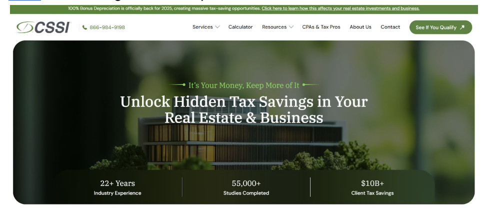 In addition to cost segregation, CSSI offers related specialty tax services such as Section 179D energy-efficient building deductions and R&D tax credits, allowing property owners to coordinate multiple incentive strategies under one provider.