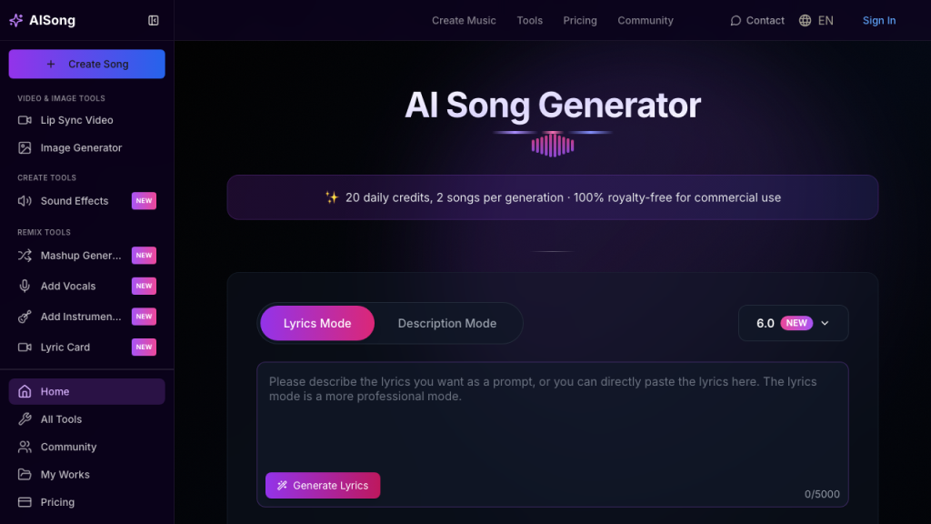 AIsong is a leading AI Song Generator, revolutionizing the creation of complete vocal tracks and comprehensive instrumental backing. It delivers full, ready-to-use songs, often with AI-generated lyrics and expressive vocal performances. Ideal for users needing end-to-end tracks without extensive production knowledge, AIsong’s AI synthesizes well-structured songs with human-like artistry. The platform focuses on delivering a cohesive, ready-to-listen song experience.