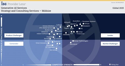 SOUTHBOROUGH, Mass., Oct. 27, 2025 /PRNewswire/ — Virtusa Corporation, a global provider of digital strategy, digital engineering, and IT services and solutions, today announced that it has been positioned as a Leader in the ISG Provider Lens™ Generative AI Services 2025 Global Report in two critical midsize market quadrants: Strategy and Consulting Services and Development and Deployment Services.