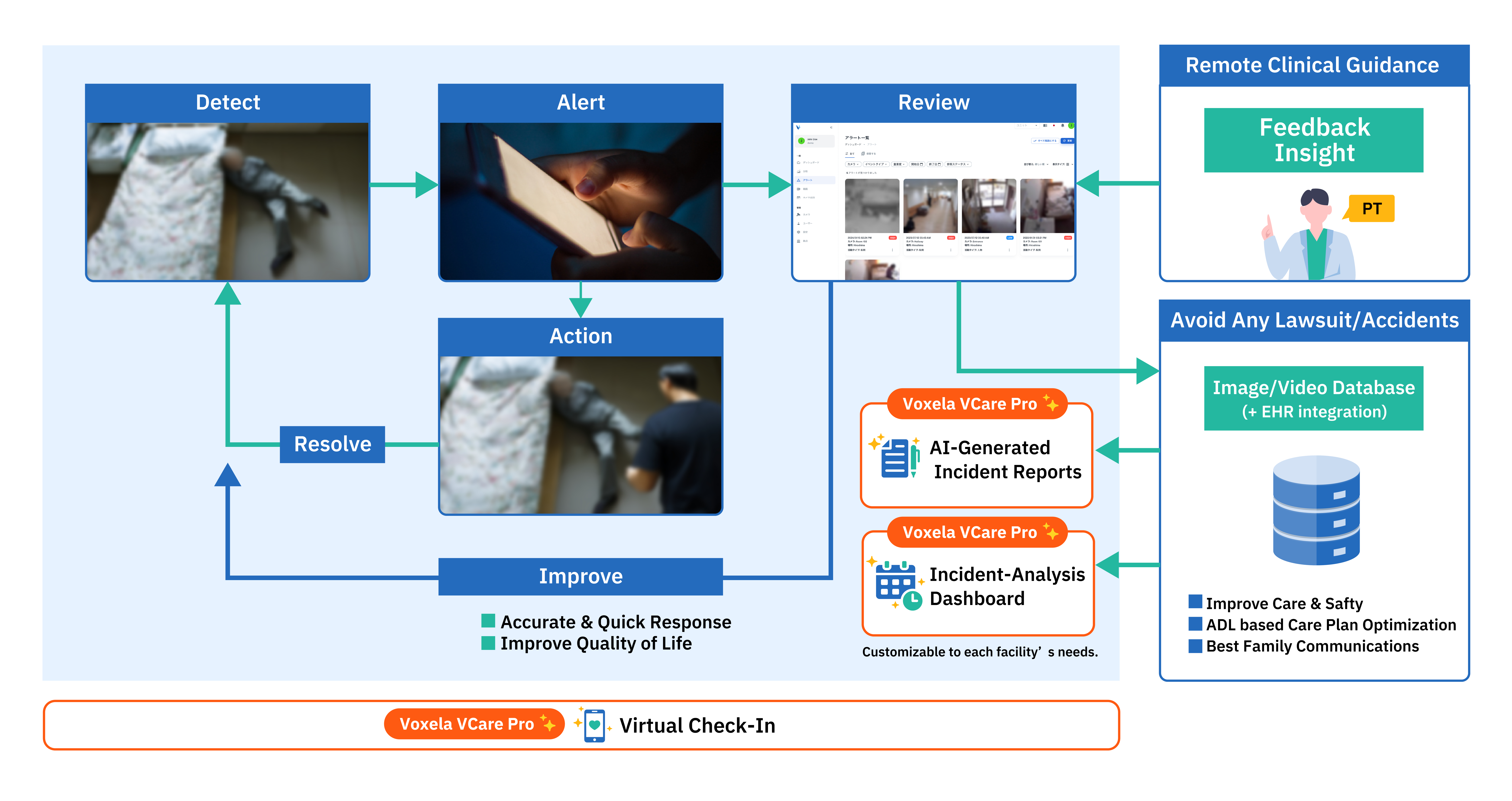 Upon detecting and notifying incidents such as falls, VCare Pro immediately analyzes the situation and automatically generates detailed, accurate incident reports. This significantly reduces the workload traditionally associated with manual reporting, allowing caregivers to focus more time and resources on resident care.