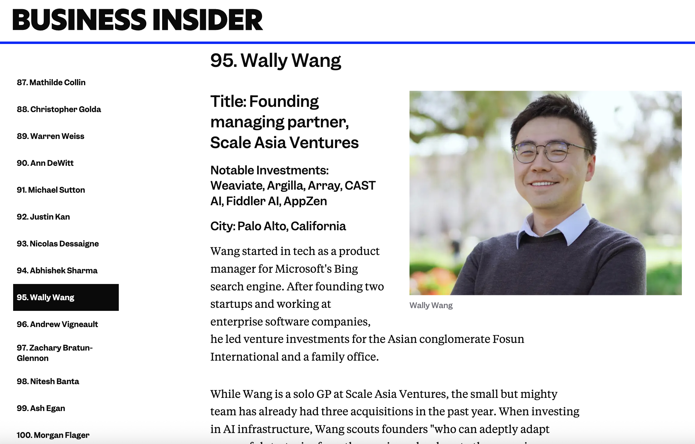 PALO ALTO, Calif.–(BUSINESS WIRE)–#aiinfra—Scale Asia Ventures (SAV), a Silicon Valley-based early-stage fund focused on AI-native enterprise software, proudly announces that Founding Managing Partner Wally Wang has been named to Business Insider’s Seed 100 list of the world’s top early-stage investors.