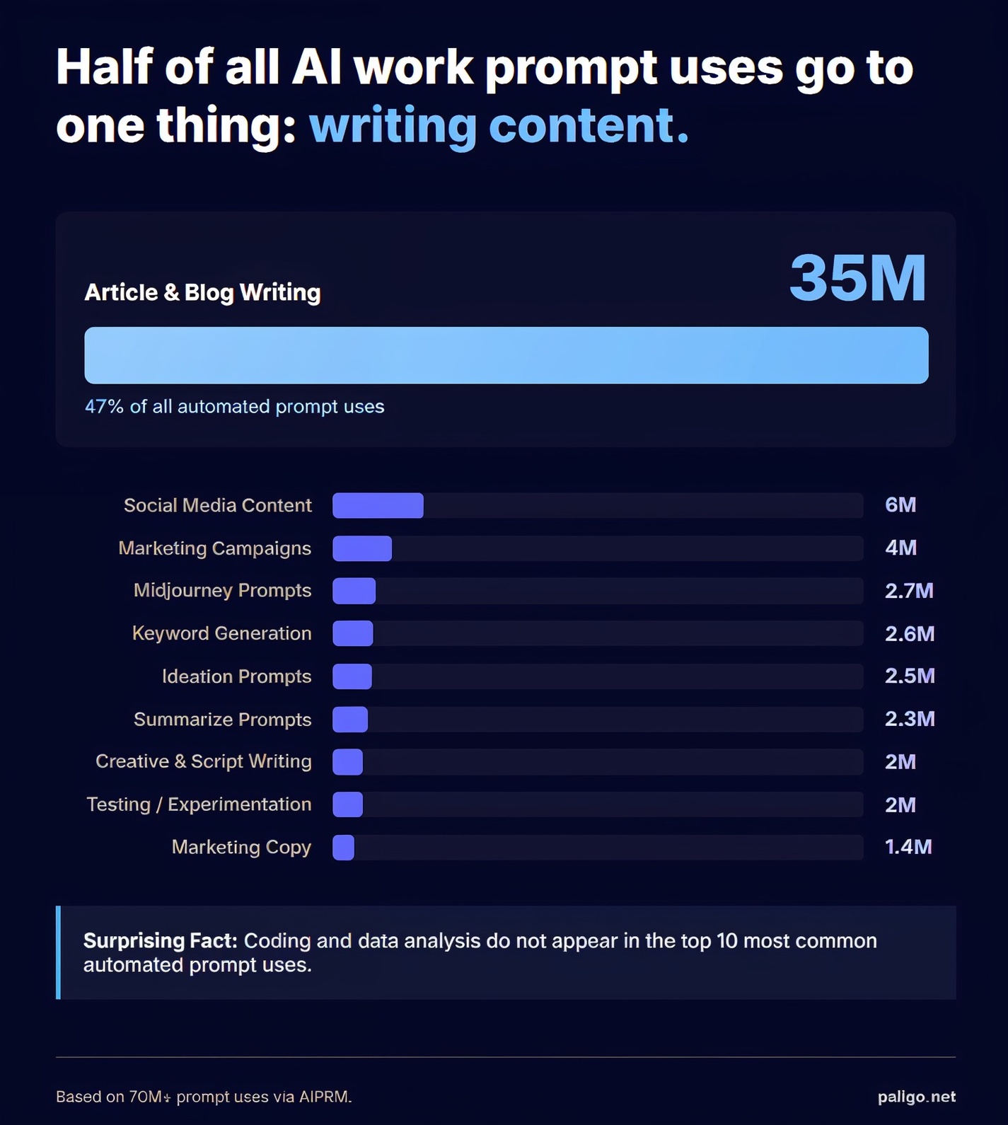 This analysis is based on 74.3 million prompt uses from AIPRM, manually categorized into 56 work task categories. The full study, including detailed methodology and category definitions, is available at Paligo.