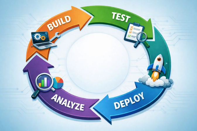 The lifecycle includes design, build, test, user testing, deployment, analysis, and iteration. Each stage informs the next. Learning is ongoing because behavior never becomes fully stable.