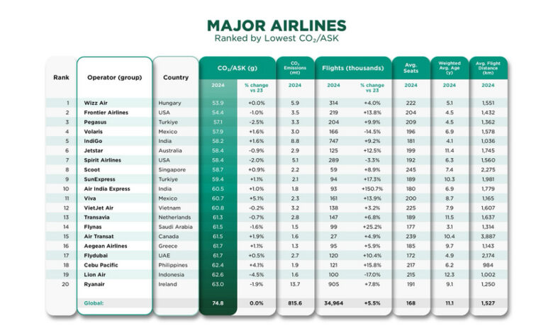 Wizz Air, Frontier, and Pegasus Top 3; The Top 20 Major Airlines Ranked by CO2 Emissions/ASK