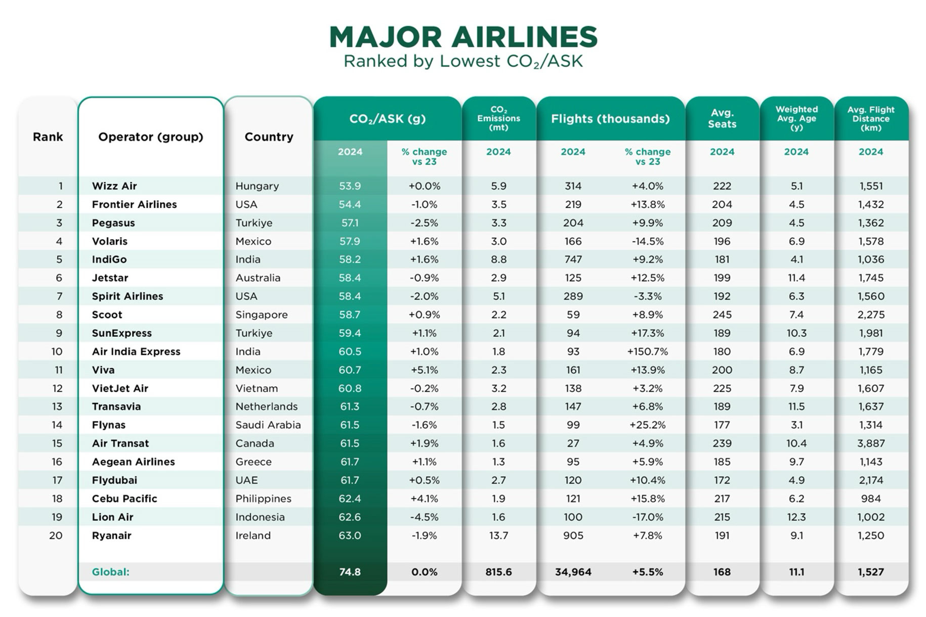 - Global Category Rankings showing the top 20 Major airlines and the World’s 10 largest airlines by CO₂ per Available Seat Kilometer