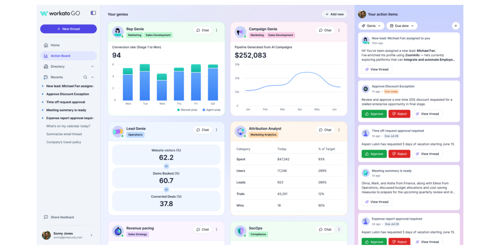 PALO ALTO, Calif.–(BUSINESS WIRE)–#automation—Workatoยฎ, the leader in agentic orchestration, announced Action Board at the companyโs World of Workato (WOW) 2025 conference. Action Board is a new capability in Workato GO where employees can engage with AI Agents, or Genies, track their key performance indicators in real-time, view open action items, dive into the processes the AI Agents are executing, and take action.