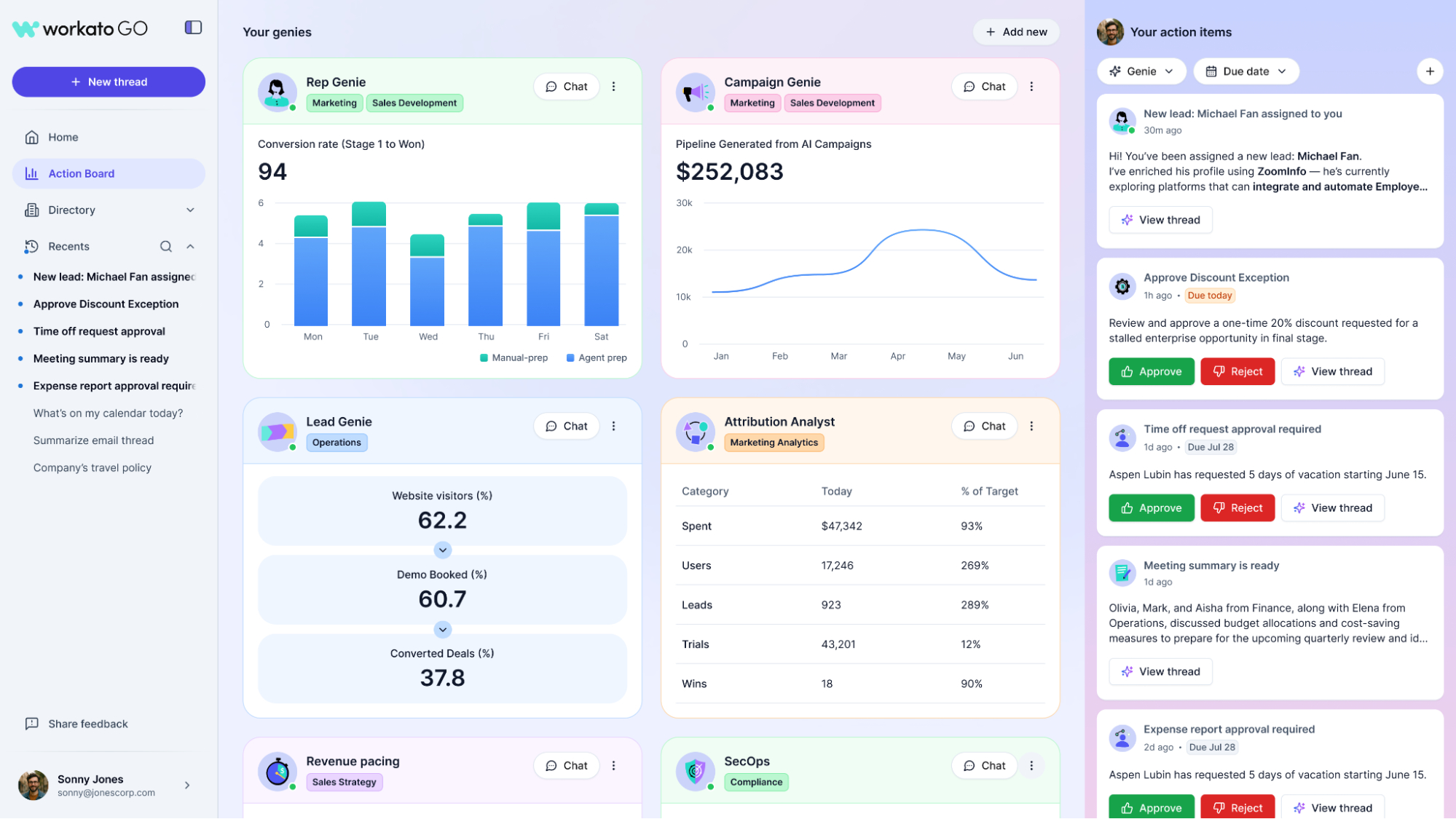 Workato Action Board makes it easy to operationalize AI agents with confidence and control. While many companies experiment with AI at the edges of their business, few have the tools to manage agents at the operational coreโwhere real business impact is made. Workato Action Board expands on Workato GO, the companyโs AI-powered super app, by giving functional teams, like IT, marketing, sales, customer service, finance, and HR, the ability to define KPIs for each Genie, engage with Genies to drill down into the results in real-time, take action, and more. It further surfaces all the activity from Genies that requires the employee to act on, like approvals.